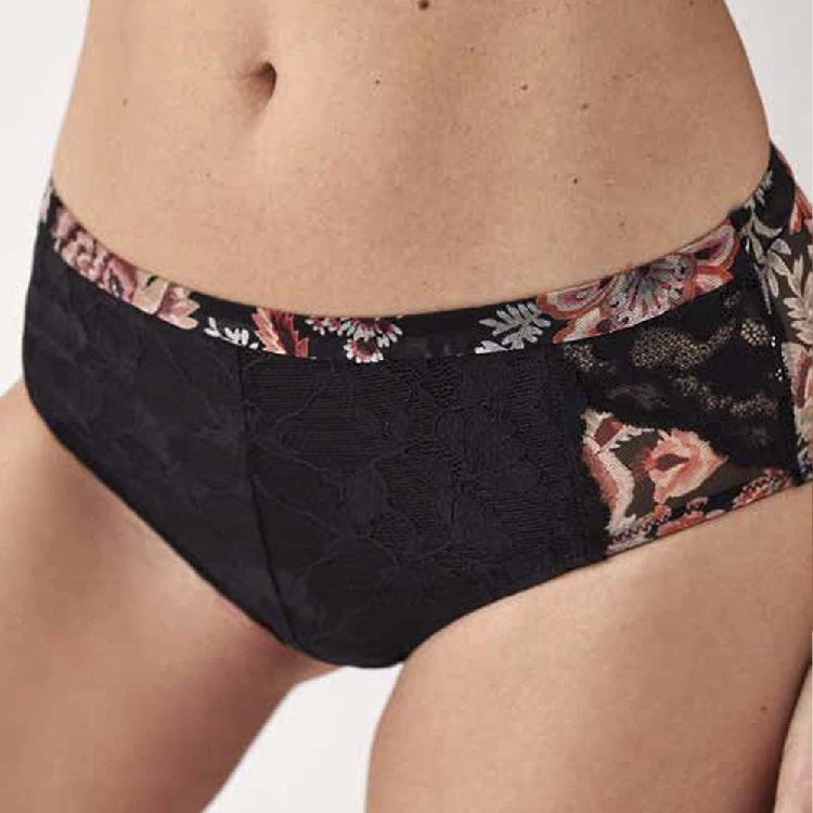 En cuanto a la parte inferior, el bikini alto combina funcionalidad y estilo de forma muy acertada. Por ejemplo, el tejido mesh estampado aporta un toque moderno y ligero. A su vez, el encaje añade un aire femenino y elegante que eleva todo el conjunto.