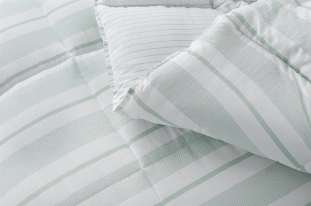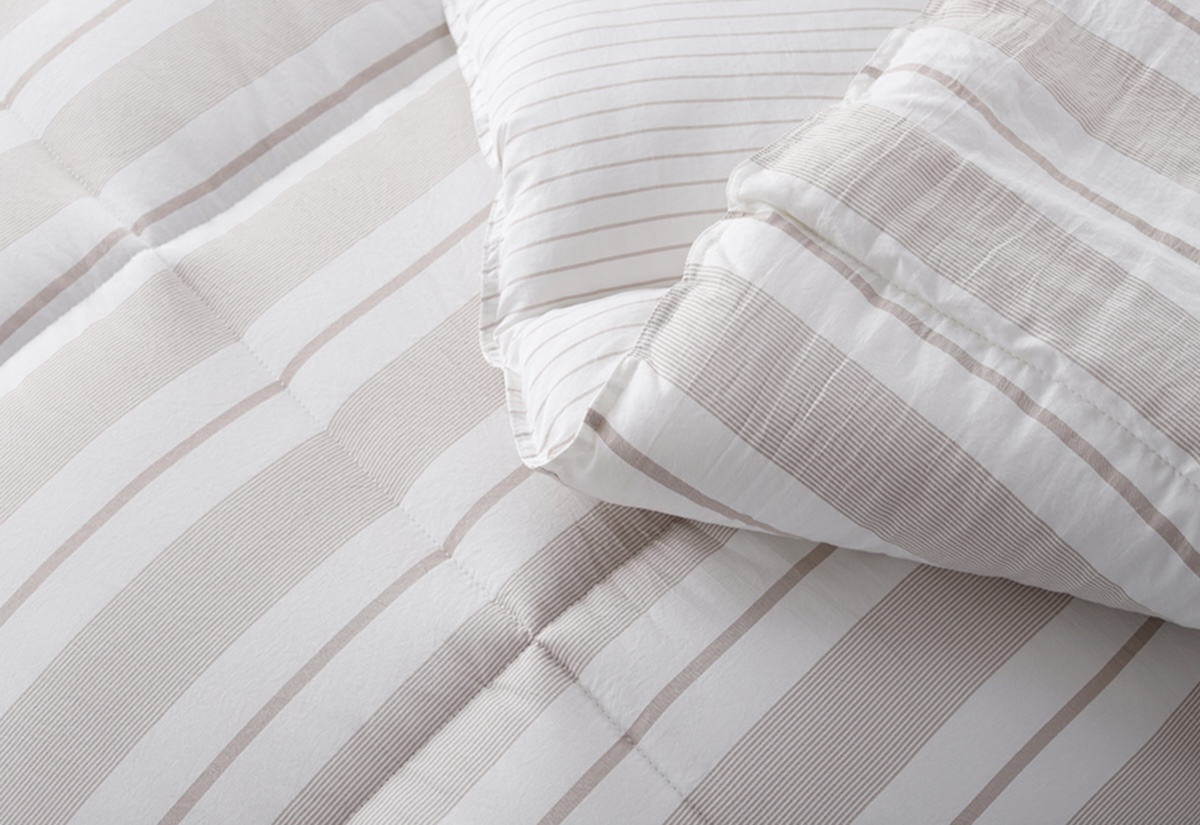 En el reverso, el diseño se transforma en una versión más sutil y delicada. Las rayas se suavizan y se afinan, creando una segunda opción más ligera y luminosa. Esto permite cambiar el estilo del dormitorio simplemente volteando el edredón.