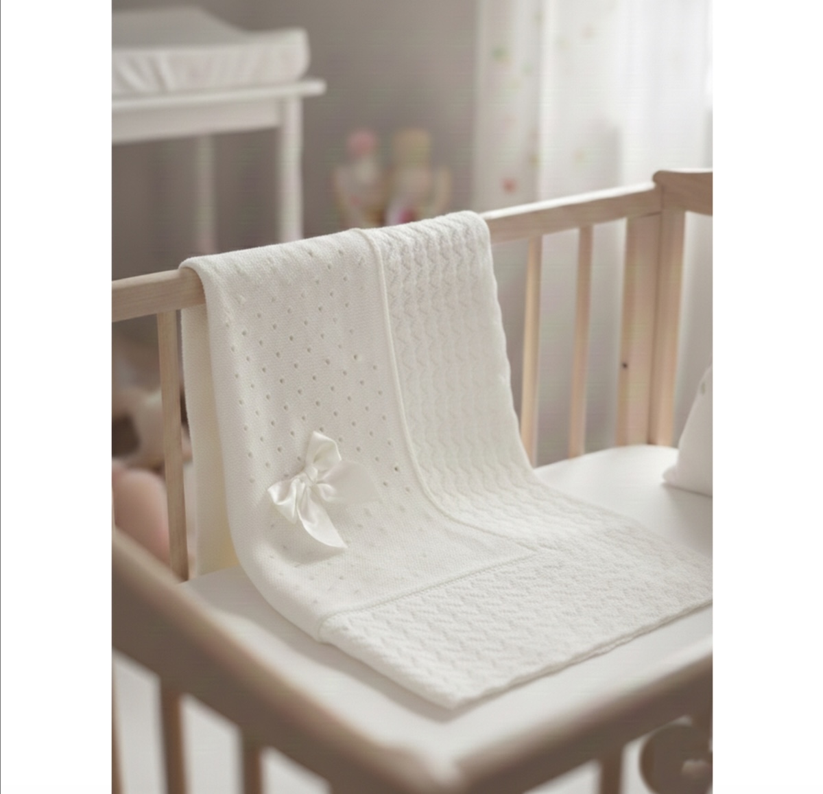 El diseño destaca por su cuidada combinación de tejido calado y punto fino, que aporta ligereza y al mismo tiempo una agradable sensación de abrigo. En la parte superior, la manta incorpora un panel de punto con pequeños detalles y un bonito lazo central, que añade un toque clásico y muy delicado.
