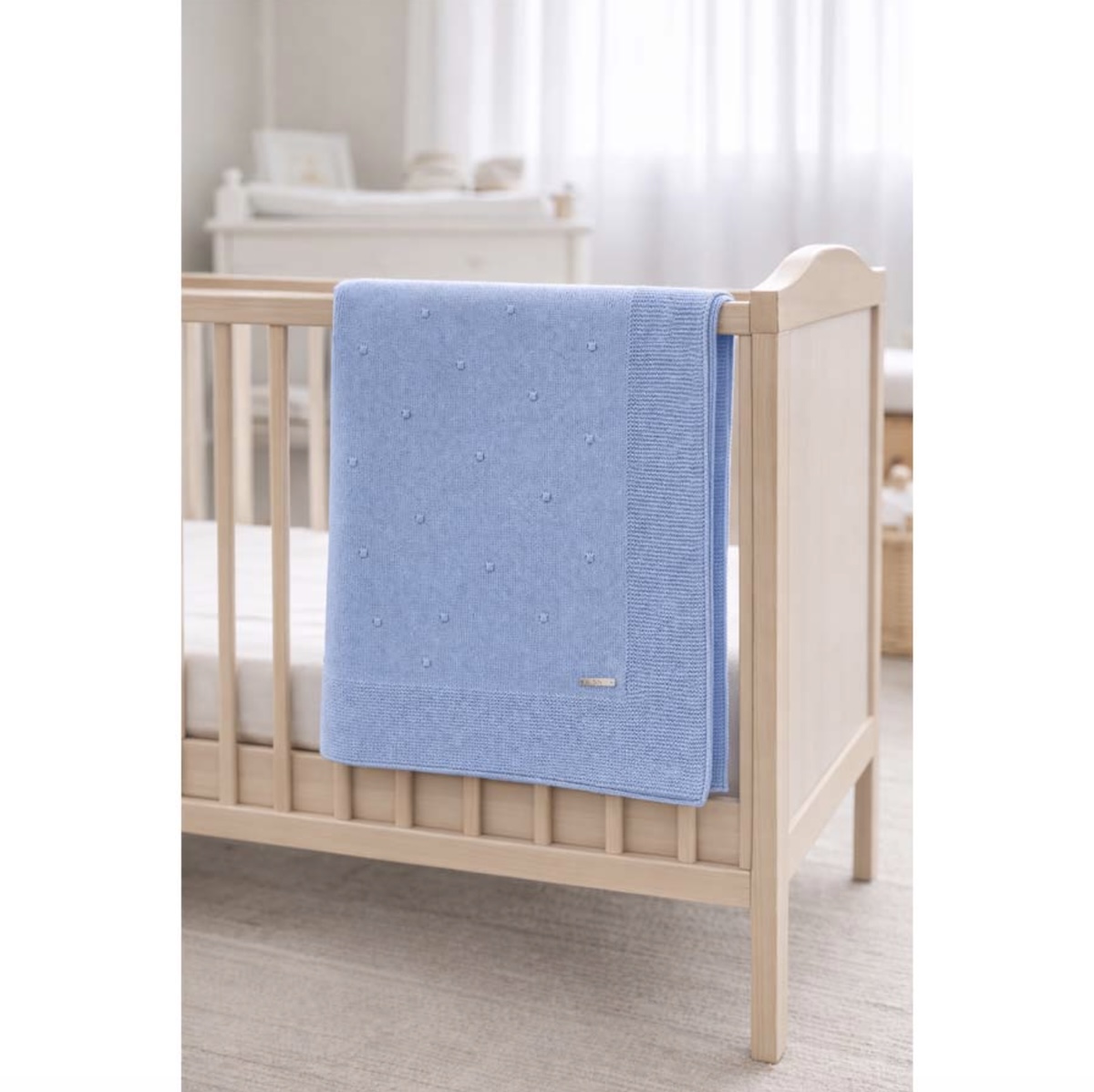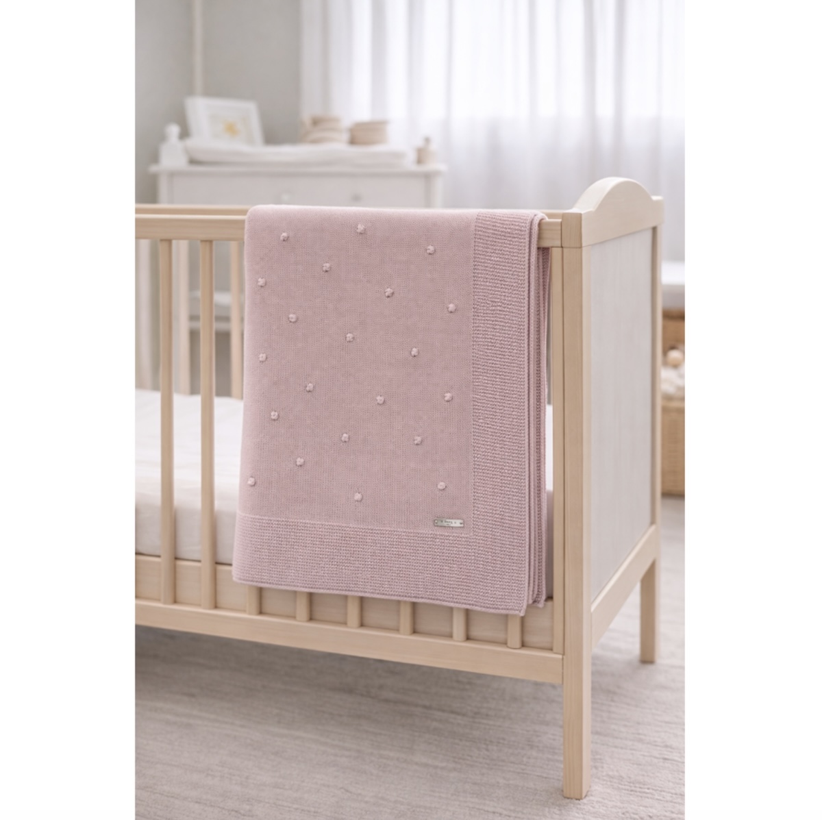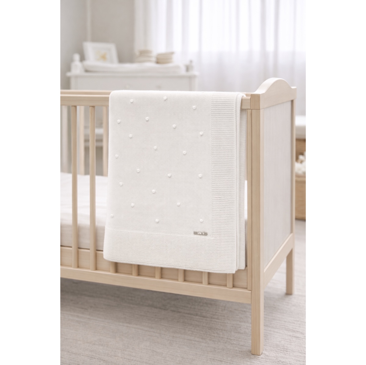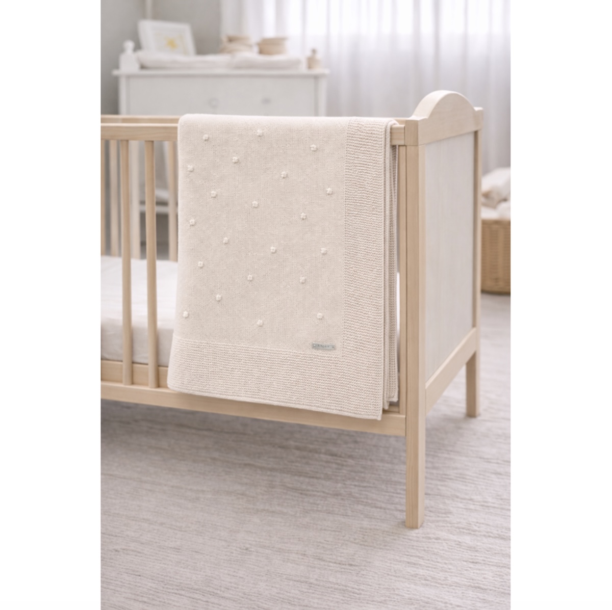El estampado minimalista de pequeños puntos tejidos crea una textura suave y agradable, ideal para el descanso del bebé. Además, el borde de punto más marcado aporta un acabado cuidado que refuerza la calidad y el diseño de la manta.